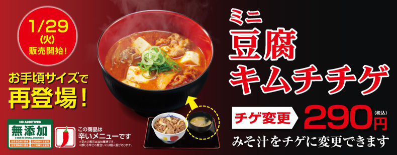 松屋は「ミニ豆腐キムチチゲ」を1月29日15時にスタートします。丼、定食などのみそ汁を追加290円で「ミニ豆腐キムチチゲ」に変えられるというもの。単品での注文も可能。