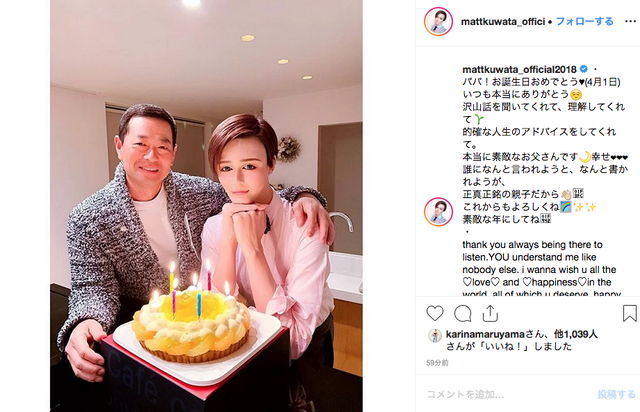 Mattは4月2日、前日に51歳の誕生日を迎えた桑田氏とのツーショットを公開。「パパ!お誕生日おめでとう」と祝福のメッセージを綴ると、「いつも本当にありがとう 沢山話を聞いてくれて、理解してくれて 的確な人生のアドバイスをしてくれて。本当に素敵なお父さんです 幸せ」と感謝の言葉を贈った。