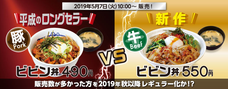 また、5月7日から20日まで「ビビン丼対決」を実施。期間中、販売数の多かったビビン丼は2019年秋以降にレギュラー化を検討すると掲げます。はたして勝利を勝ち取るのはどちらのビビン丼か! 対決のゆくえも気になります!