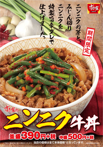 すき家本部が展開する牛丼チェーン店「すき家」は「ニンニクの芽牛丼」を7月3日9時から販売します。価格は並盛500円。
