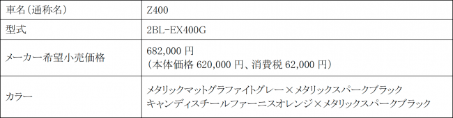 株式会社カワサキモータースジャパン(本社:兵庫県明石市、代表取締役社長:寺西 猛)は、「Z400」を2019年11月1日(金)に発売いたします。