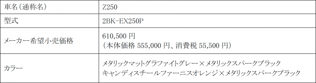 株式会社カワサキモータースジャパン(本社:兵庫県明石市、代表取締役社長:寺西 猛)は、「Z250」を2019年11月1日(金)に発売いたします。