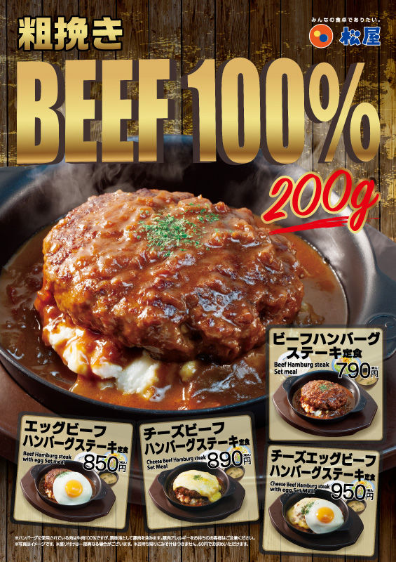 200gの大ボリュームな粗挽きハンバーグに松屋特製ブラウンソースをかけたという仕立て。パテは牛肉を100%使用しており、牛肉本来の味を楽しめるそうです。
